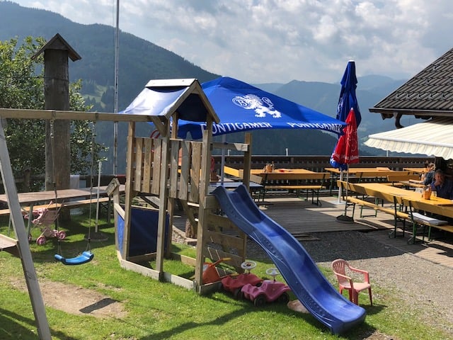 Auf der Moosalm angekommen erfreuen sich die Kids über das frei herumlaufende Pony, die Ziegen, Katzen und Hasen und über den kleinen, aber feinen Spielplatz mit Rutsche, Schaukel, Sandkiste und verschiedenen Fahrzeugen. Mama und Papa können sich auf der Terrasse mit traumhaften Ausblick von der Wanderung erholen.