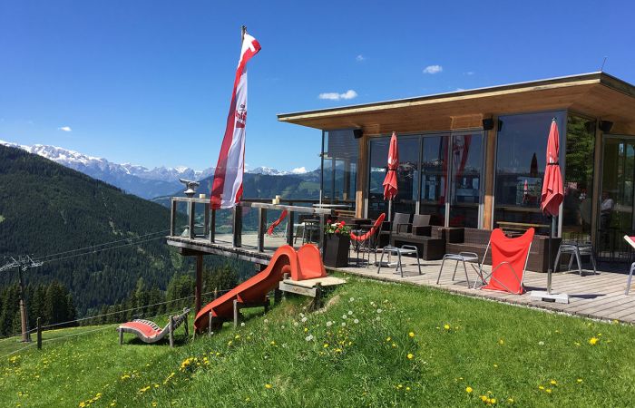 Während sich deine Kids austoben, kannst du die Sonnenterrasse mit Traumpanorama auf die Bergwelt genießen oder in einem Liegestuhl am Badeteich relaxen.